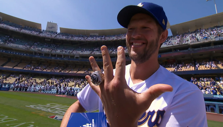 El futuro Salón de La Fama, Clayton Kershow, fue que recibió la más grande ovasión por parte del público en el Dodger Stadium, fue su primer anillo de Serie Mundial, estuvo acompañado de Mokie Betts, Cody Bellinger, Justin Turner, Kenley Jensen y Corey Seagar, quienes tambien recibieron un fuerte aplauso de la aficción, el anillo tiene 232 diamantes y 53 zafiros.. Fuio..