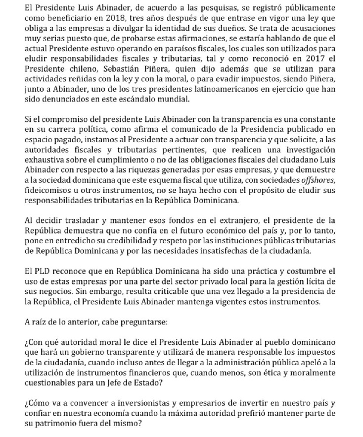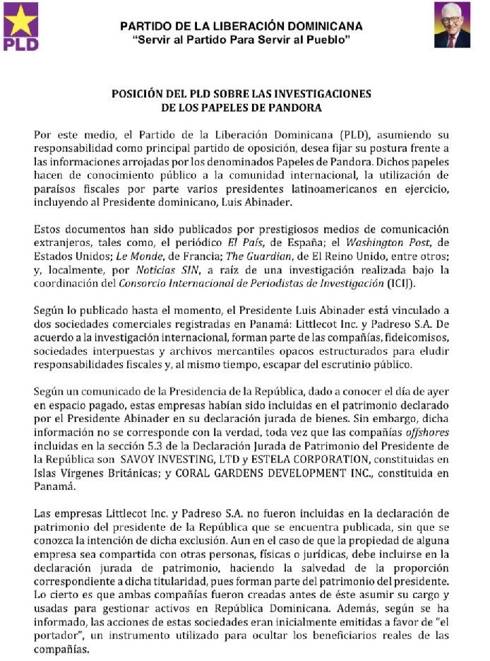 “Las empresas Littlecot Inc. y Padreso S.A, no fueron incluidas en declaración de patrimonio del Presidente de la República que se encuentra publicada, sin que se conozca la intención de dicha exclusion. Aun en el caso de que la propiedad de una empresa sea compartida con otra persona, física o jurídica, debe incluirse en la declaración jurada de patrimonio, hacienda la salvedad de la proporción correspondiente a dicha tutilidad”, dice el partido de oposición en un comunicado en el que plantea su posición sobre la investigación de los Papeles de Pandora.