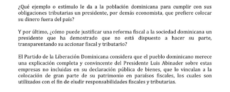 Agrega que “Lo cierto es que ambas compañías fueron creadas antes de éste asumir su cargo y usadas para gestionar activos en la República Dominicana. Además, según se ha informado, las acciones de estas sociedades eran emitidas inicialmente a favor de “el portador”, un instrumento utilizado para ocultar los beneficiacios reales de las compañías”.