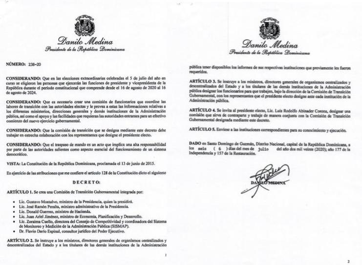 El mandatario invitó al presidente electo Luis Abinader Corona a designar una comisión que sirva de contraparte y trabaje de manera conjunta con la Comisión de Transición Gubernamental designada mediante este decreto.