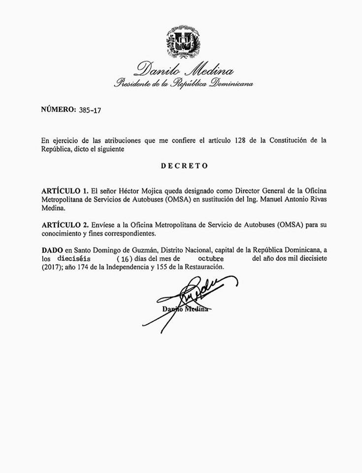 SANTO DOMINGO.- El presidente Danilo Medina destituyó este lunes al director de la Oficina Metropolitana de Autobuses (OMSA), Manuel Antonio Rivas Medina, quien está detenido y es investigado por el asesinato del abogado y profesor de la Universidad Autónoma de Santo Domingo (UASD), Yuniol Ramírez.