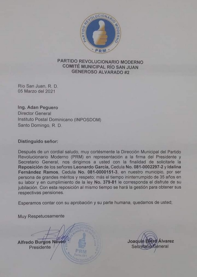 Esas cancelaciones causaron indignación en el pueblo, y desde entonces se venían haciendo gestiones para su reposición, incluyendo miembros del gobernante Partido Revolucionario Moderno (PRM), cuyos dirigentes locales habían enviado una comunicación en tal sentido al director general del Instituto Postal Dominicano, Adan Peguero, según circula en las redes sociales, con fecha del 5 de marzo.