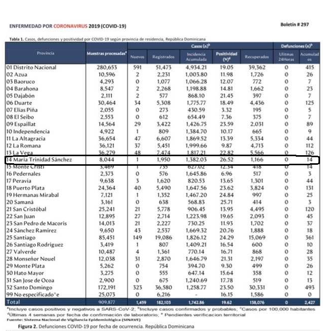 Según el último boletín de Salud Pública publicado este domingo, la provincia María Trinidad Sánchez ocupa el mayor grado de positividad en todo el país con más de un 26.