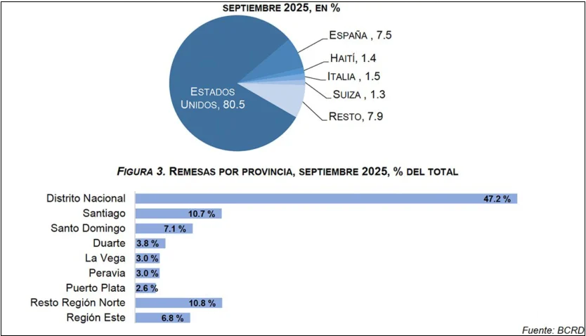 Estas tres demarcaciones (Distrito Nacional + Santiago + Santo Domingo) suelen recibir cerca del 65 % de los flujos de remesas.