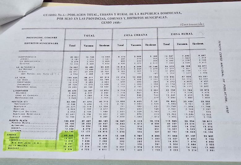 Estos datos concuerdan con lo que en vida me aportara el Dr. Pedro Jorge Blanco (Perucho), quien llegó a Río San Juan en 1948 como médico sanitario e hizo un censo de las viviendas, contando 148 casas, que con un promedio de 5 personas por casa, éramos realmente 740 habitantes.