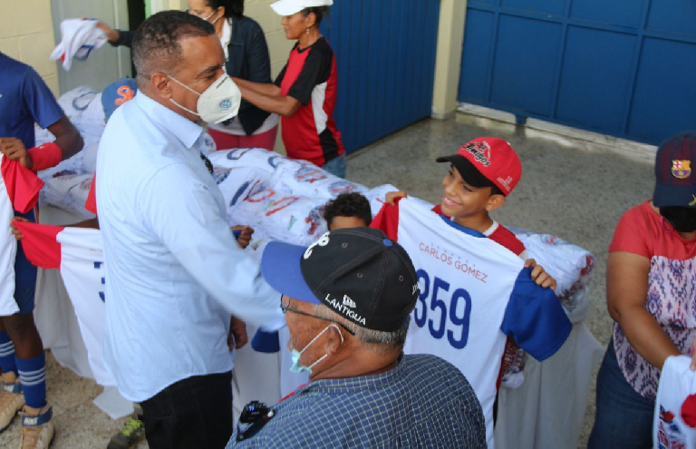Moca.- El representante senatorial de Espaillat, Carlos Gómez, entregó de todos los uniformes a la Liga David Lantigua para el Maratón de Pequeñas Ligas.